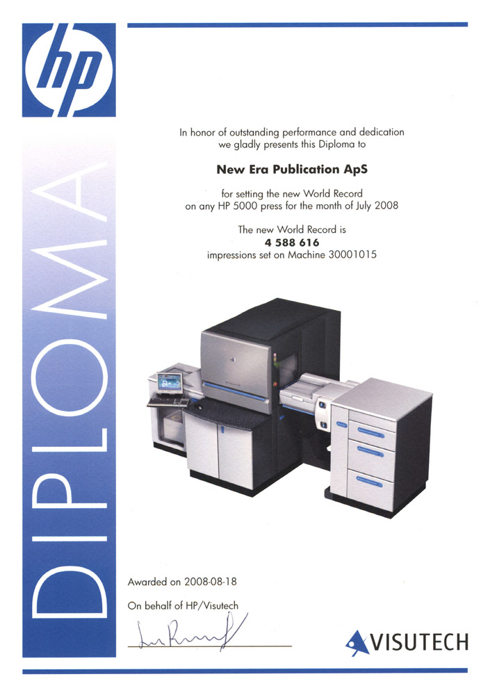 Hewlett Packard, også kendt som HP, er et multinationalt amerikansk firma grundlagt i 1935, og en af verdens største udbydere af it-udstyr og -applikationsløsninger. HP har specialiseret sig i udvikling og fremstilling af alle former for digital hardware, herunder en bred vifte af digitale printere og billedbehandlingsprodukter. Optegnelser føres løbende i hele Europa og i verden for antallet af sider produceret på en given trykmaskine, og de kunder, der overstiger verdensrekorden, anerkendes af både Hewlett Packard og deres forhandler, Visutech, med en æresbevisning for præstationen.